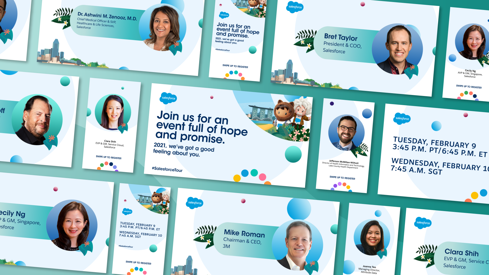 During the pandemic, Salesforce hosted a large number of virtual events; I provided design, illustration and animation assets for social content promoting these events across multiple channels.